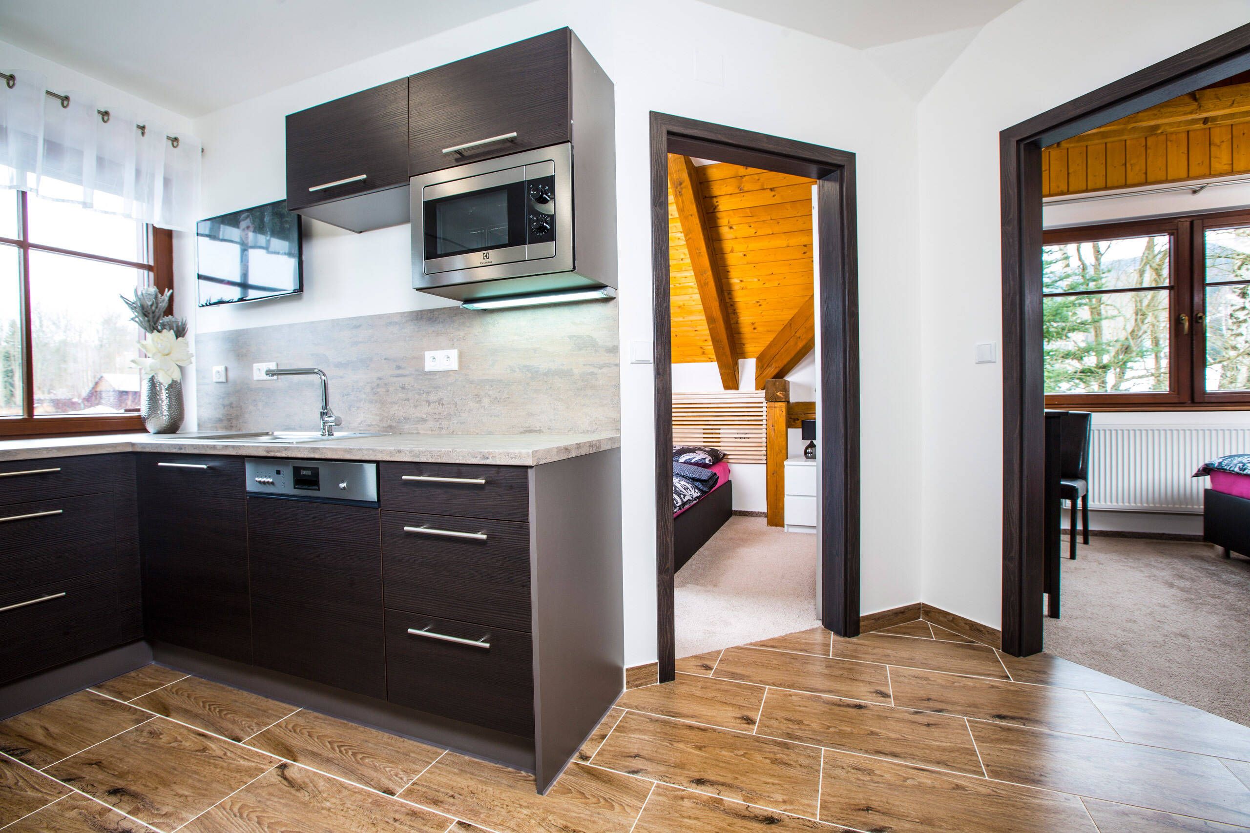 equipped kitchen (ceramic hob, dishwasher, electric kettle, microwave, fridge with freezer, dishes)